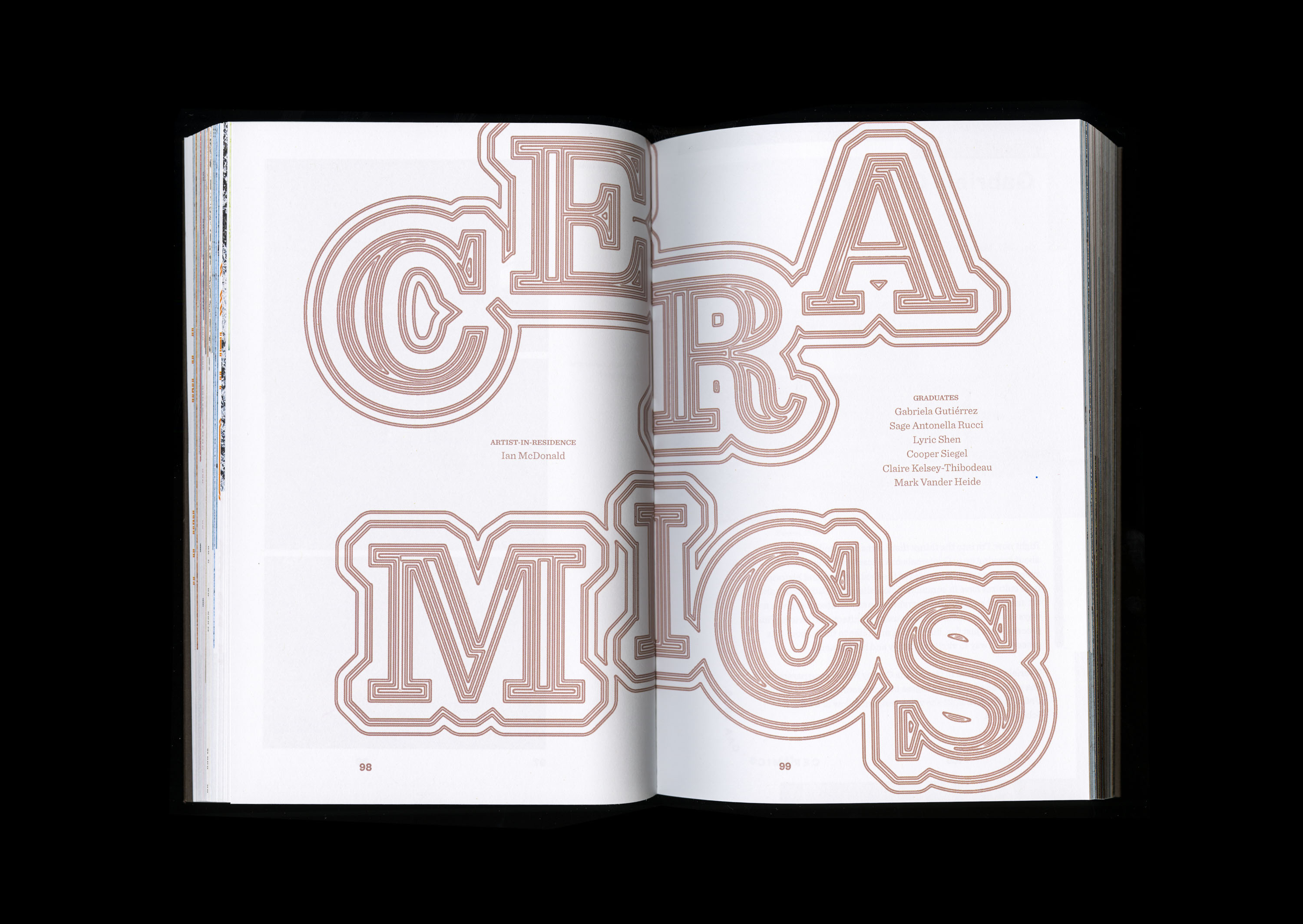 Publication design for Cranbrook Academy of Art’s 2022 Graduate Degree Exhibition, held at the Cranbrook Art Museum. The book imagines each MFA candidate’s practice as a specific site framed within their departments, within the Academy, and within the larger intersectional discourses that enliven this time, making reference to Cranbrook’s bespoke radiating doors on the cover. Other custom linework and photographic framing make subtle references to the architecture, geology, and textural landscape of this strange and unique environment, grounding each artist’s work in Cranbrook as a shared site of practice and exploration.